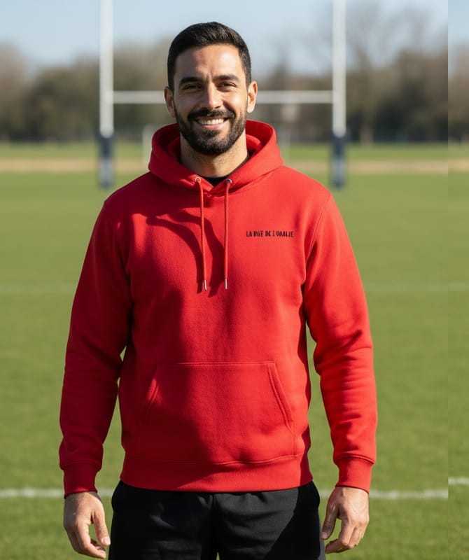 En 100% coton bio et d'une coupe standard, il est doté d'une poche kangourou et des cordons de serrage ronds aux embouts métalliques. L'imprimé La Rue de L'Ovalie est sérigraphié sur la poitrine et notre inscription Yvandurugby emblématique figure sur le haut du dos sous la capuche.